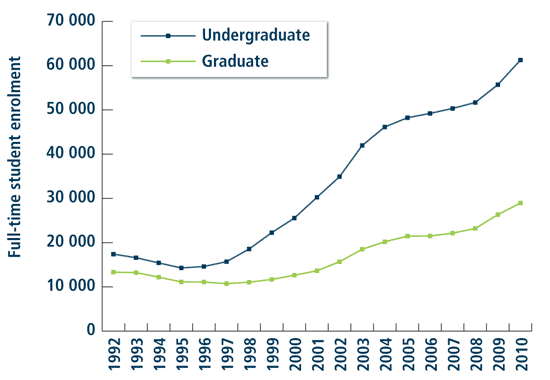 加拿大大學(xué)協(xié)會(huì)于今天發(fā)行了第四期研究大學(xué)教育價(jià)值的手冊(cè),《全球市場(chǎng)環(huán)境下的教育價(jià)值》一文指出加拿大的國際學(xué)生比例保持了連續(xù)十五年的上升趨勢(shì),目前有9萬全日制留學(xué)生在加學(xué)習(xí),是1998年的三倍。