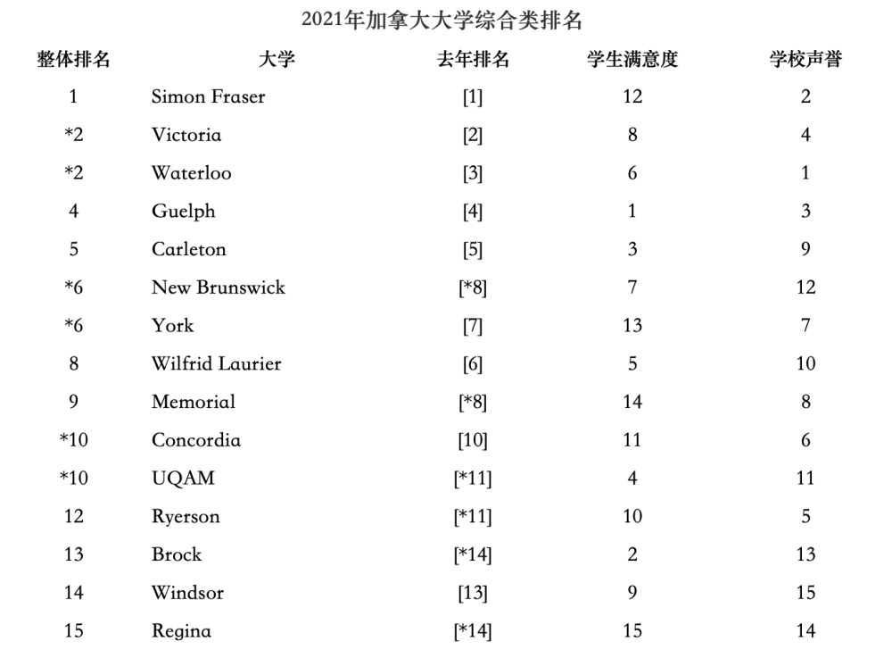 綜合類大學,具有相當?shù)难芯克?,并且在本科和研究生級別上都有各種課程,涵蓋了大部分專業(yè)學位。此次排名,前五名與2020年排名完全一致,排名第一的依然是西蒙菲莎大學,維多利亞大學和滑鐵盧大學緊隨其后。