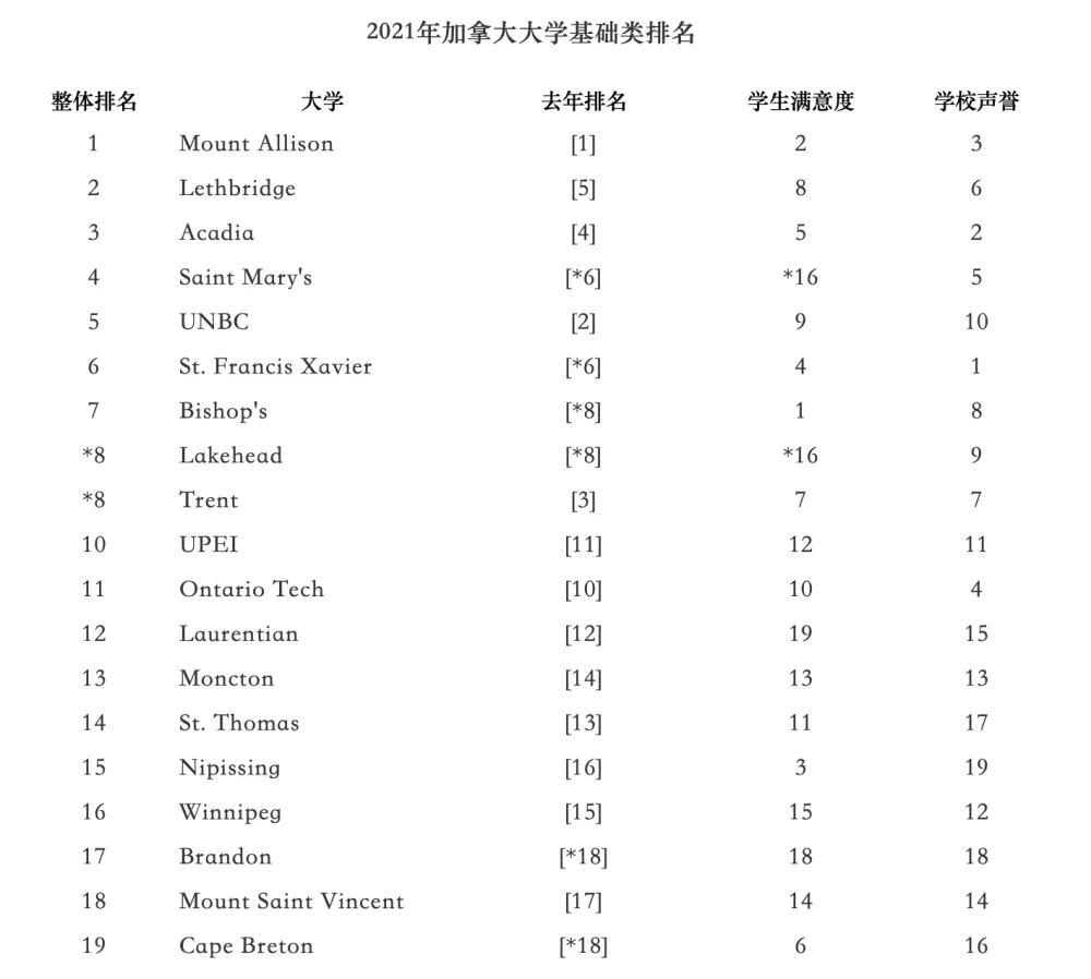 在基礎類院校中,位于第一的是蒙特愛立森大學,第二名是萊斯布里奇大學,第三名是阿卡迪亞大學。