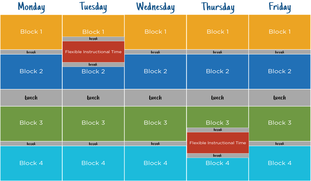 時(shí)間表包括每周兩段靈活的教學(xué)時(shí)間:周二50分鐘和周四50分鐘。這是旨在支持個(gè)性化學(xué)生學(xué)習(xí)選擇的教學(xué)時(shí)間。在此期間,所有學(xué)生和老師都在現(xiàn)場(chǎng)。學(xué)生可以參加每周課程、與同齡人合作、會(huì)見個(gè)別教師或從事可能超出預(yù)定課程范圍的學(xué)習(xí)活動(dòng)。將為學(xué)生提供教師和支持。