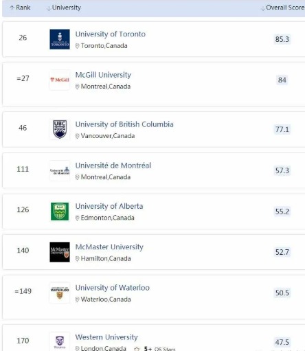 加拿大比較出名的三所大學(xué)分別為英屬哥倫比亞大學(xué)、麥吉爾大學(xué)和多倫多大學(xué)。在2022年QS世界大學(xué)排名中,多倫多大學(xué)排名世界第26,麥吉爾大學(xué)排名世界第27,英屬哥倫比亞大學(xué)排名世界第46。