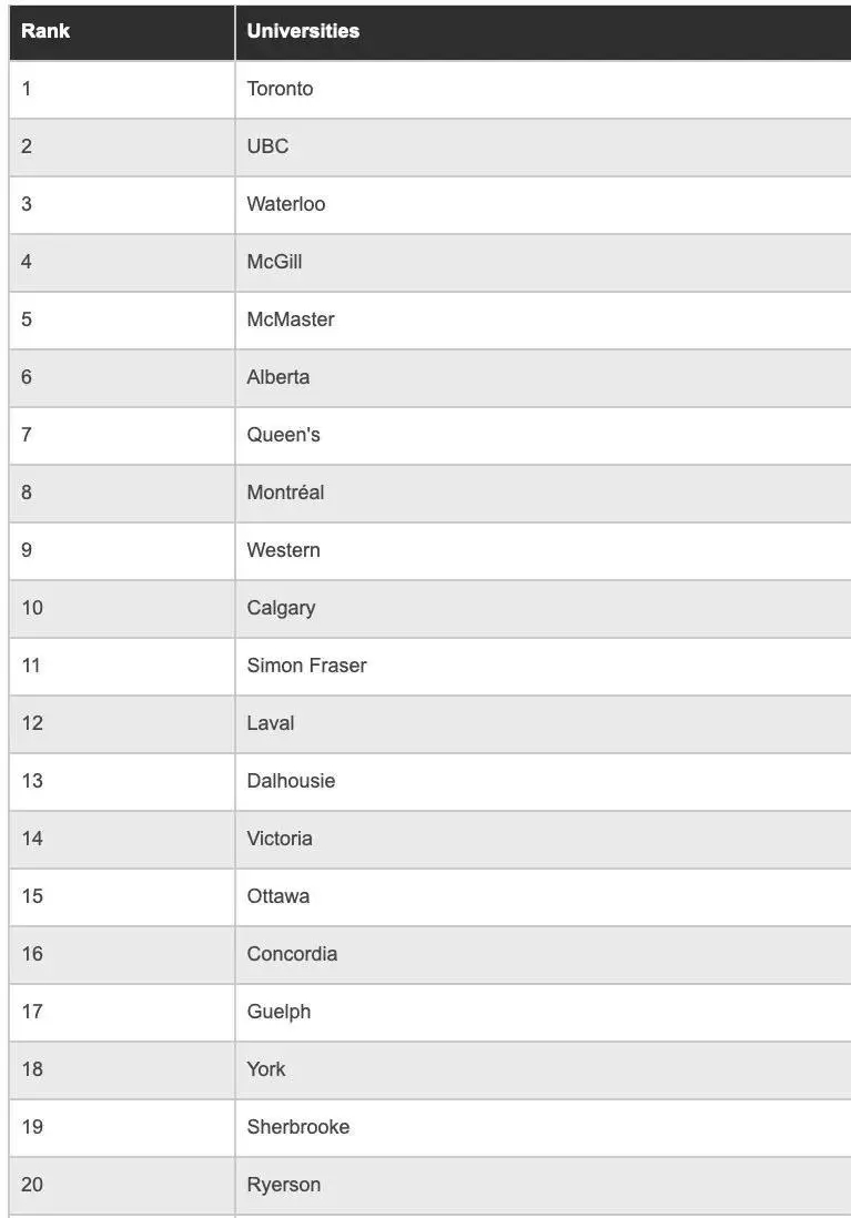 多倫多大學連續(xù)第7年蟬聯(lián)榜首,UBC排名第2,滑鐵盧大學第3。進入前十的依次還有麥吉爾大學、麥克馬斯特大學、阿爾伯塔大學、女皇大學、蒙特利爾大學、西安大略大學,以及卡爾加里大學。SFU排名第11,距前十僅一步之遙。