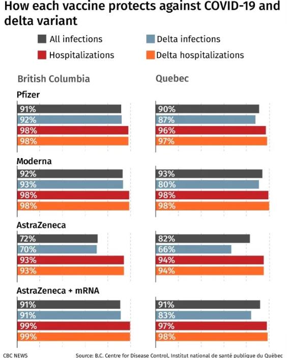 與BC省的數(shù)據(jù)相似,魁省的研究還表明,接種輝瑞、莫德納或阿斯利康疫苗,對加拿大所有新冠變種病毒(包括Delta)預(yù)防住院的有效率超過92%。
