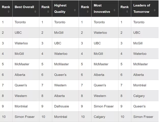 加拿大麥考林雜志調(diào)查了加拿大大學(xué)的的教職員工和高級(jí)管理人員以及全國(guó)各地的商界人士,向他們?cè)儐?wèn)對(duì)加拿大大學(xué)的質(zhì)量和創(chuàng)新的看法。將所有大學(xué)從本科、綜合和和醫(yī)學(xué)博士類合并為一組,最后排名了49所加拿大大學(xué)。我們發(fā)現(xiàn),滑鐵盧大學(xué)的排名超越了麥吉爾大學(xué),擠進(jìn)了加拿大大學(xué)的“前三”。
