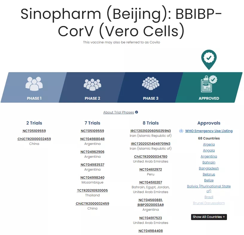 在阿根廷、巴林、埃及、摩洛哥、巴基斯坦、秘魯和阿聯(lián)酋完成三期試驗,并且得到了68個國家的批準(zhǔn)使用。
