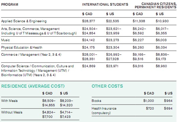 下表按學(xué)院與專業(yè)統(tǒng)計(jì)了多倫多大學(xué)國(guó)際留學(xué)生與本國(guó)學(xué)生的學(xué)費(fèi)和生活費(fèi),供大家查閱參考: