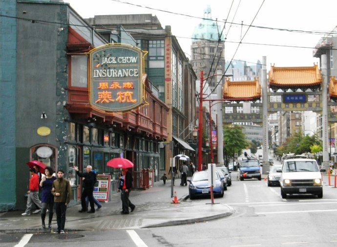 圖1:溫哥華唐人街的一個路口。圖中行人正要踏上人行橫道,這一瞬間起車輛就不能再通過了。