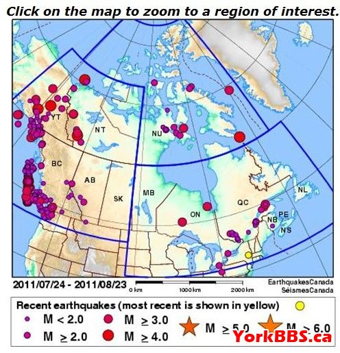 去年(2010)年6月23日13點(diǎn)41分41秒,加拿大安省發(fā)生5.0級(jí)地震,震中位于渥太華北部53公里處的安省和魁省交界處,深度達(dá)地下18公里。加拿大的蒙特利爾、多倫多,安省最南部的溫莎也有明顯震感;美國的波士頓和克里夫蘭均有震感,甚至紐約和部分州也有震感。
