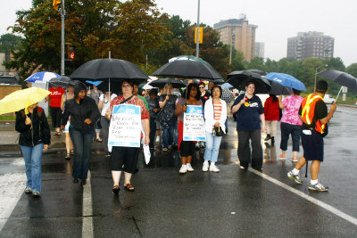 由于安省公務(wù)員工工會(Ontario Public Service Emploees Union)與安省社區(qū)學(xué)院的勞資談判破裂,全省24所學(xué)院后勤員工1日起開始罷工。1日一早,百年學(xué)院(Centennial College)位于Progress Ave.的主校區(qū)門口就聚集了大量后勤員工展開罷工游行。