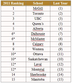 2011年加拿大大學(xué)最新排名: