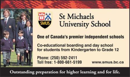 St. Michaels University School,簡(jiǎn)稱SMUS,是BC 省排名第一的學(xué)校。由建校于1906年的University School 及建校于1910年的 St. Michaels School合并而成,兩所學(xué)校于合并前皆只收男生,1978年SMUS開(kāi)始招收男女學(xué)生。目前招收幼兒園到12年級(jí)男女的學(xué)生,本地學(xué)生多為通勤,來(lái)自其它地區(qū)的學(xué)生則皆住宿,全校約870名學(xué)生,55﹪為男生,45﹪為女生,寄宿生中約50﹪為國(guó)際學(xué)生。